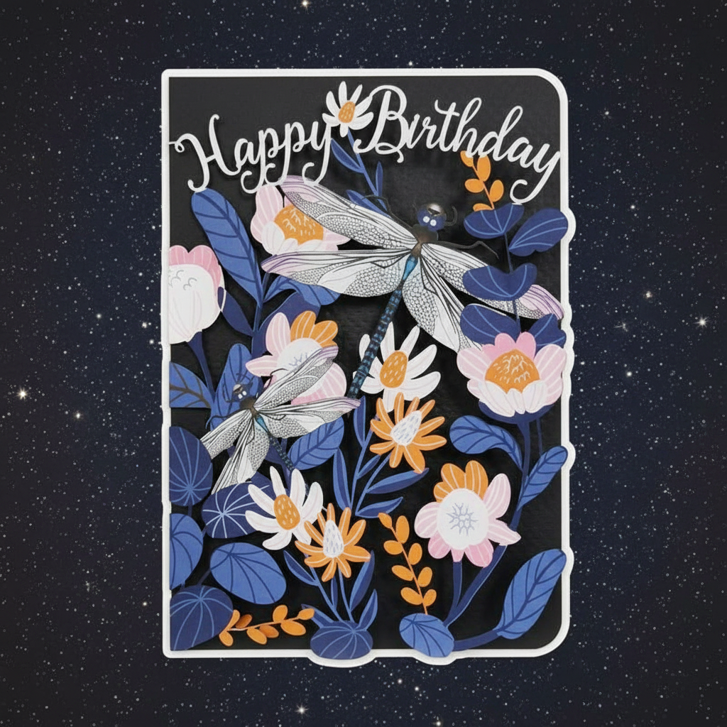 ALLJOY. Original paper cut card. Birthday Dragonfly.