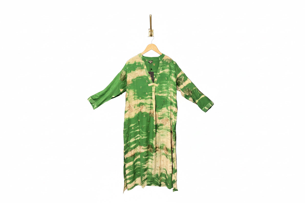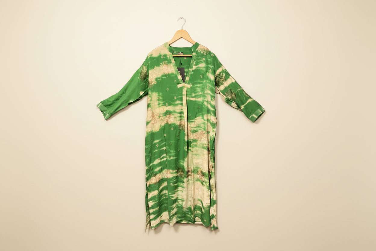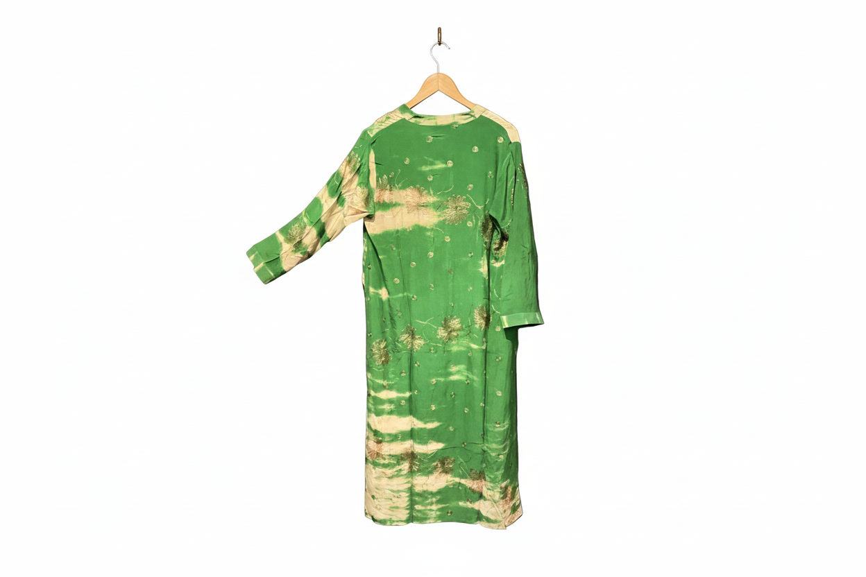 Jakken har lange ermer og er lett vattert, med knapper foran og subtile kontrastdetaljer på skuldrene. Disse diskrete detaljene balanserer den avslappede silhuetten med håndverksmessig presisjon.
